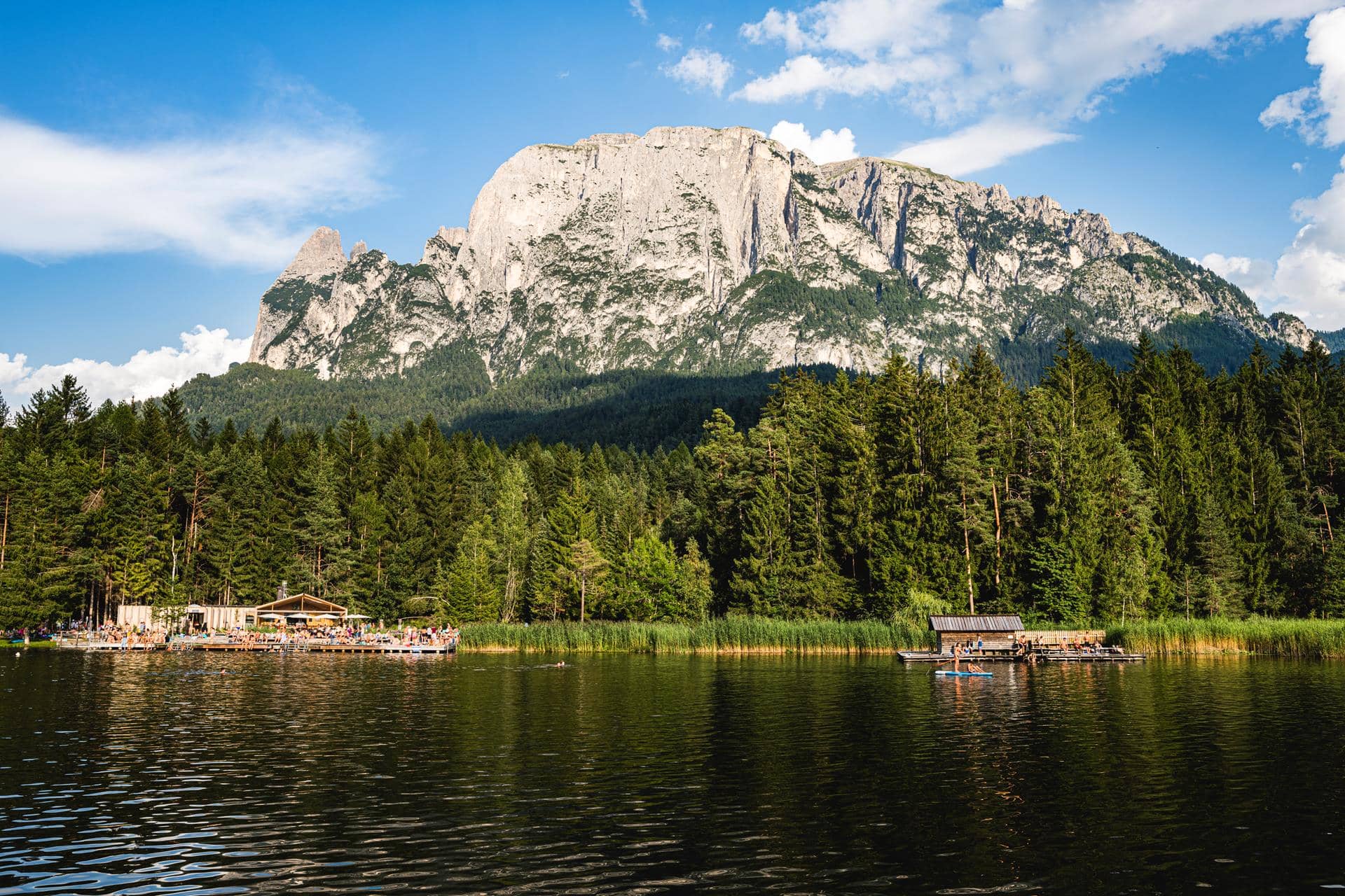 Der See ist auch mit dem Auto leicht erreichbar: Von Völs am Schlern geht es nur etwa einen Kilometer Richtung Seis, dann rechts zum Parkplatz. So lässt sich ein Badestopp perfekt mit einer Wanderung am Schlern verbinden.