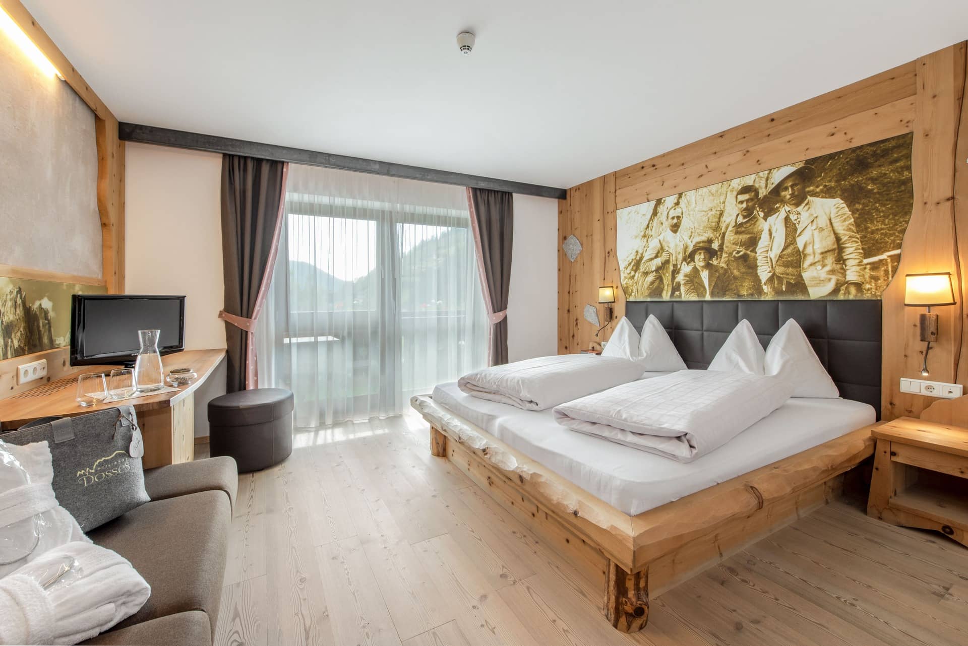 Eine behagliche Hommage an unseren Urgroßvater: Das alpine Doppelzimmer (ca. 24 m²) erfreut Sie mit seinem Zirmholz-Interieur. Es hat eine Couch, Naturholzboden, Badezimmer in Naturstein mit WC sowie einen schönen Balkon mit Berg- oder Talblick. Für entspannte Momente im Freien finden Sie auf dem Balkon eine einladende Bestuhlung.
