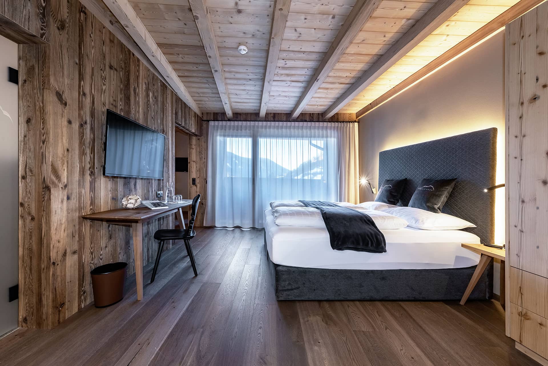 Molto spazio (40 m²) e un arredamento confortevole conferiscono alla Suite Dosses un atmosfera elegante. Materiali di alta qualità, mobili in legno naturale di abete rosso, parquet in legno di quercia e un concetto di illuminazione e colore finemente accordato rendono il vostro soggiorno nella Suite Dosses estremamente piacevole. Il soffitto in legno e il design delle pareti in legno antico bruciato dal sole creano un fero fascino alpino. Oltre alla spaziosa zona notte, la Suite Dosses offre un'accogliente zona soggiorno con divano che può essere schermata con un divisorio mobile in legno e usata come seconda zona notte.