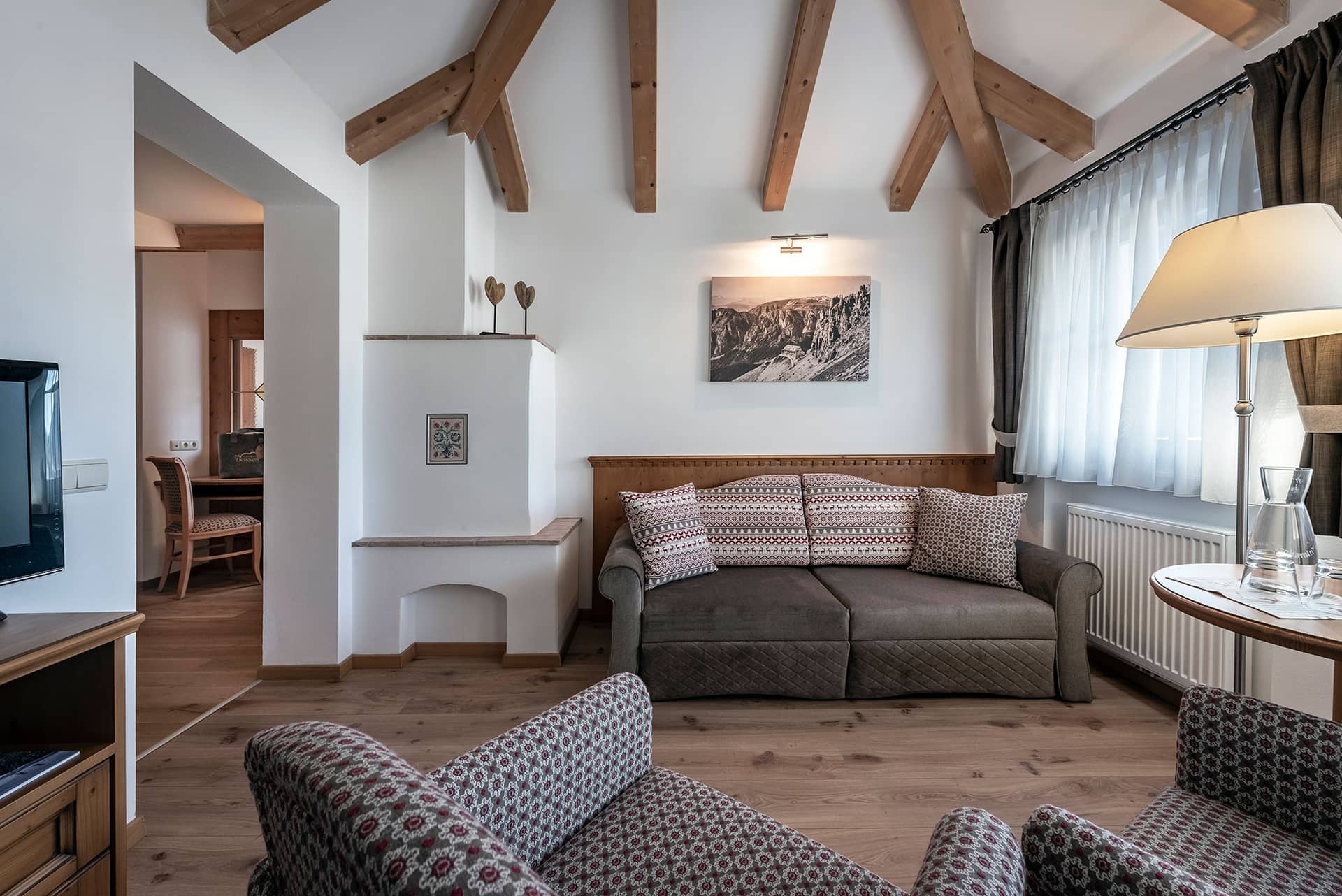 Attenzione famiglie! Nella torre si trova anche la nostra grande suite mansardata (45 m²) con zona giorno e notte separate. La tradizionale stufa in maiolica e i mobili in legno naturale di abete rosso creano un'atmosfera accogliente. Il bagno spazioso e luminoso possiede una doccia e un bidet. A vostra disposizione avete anche un ulteriore WC separato. Il balcone è baciato dal sole pomeridiano e offre un’incantevole vista sulla Cappella di San Cipriano.