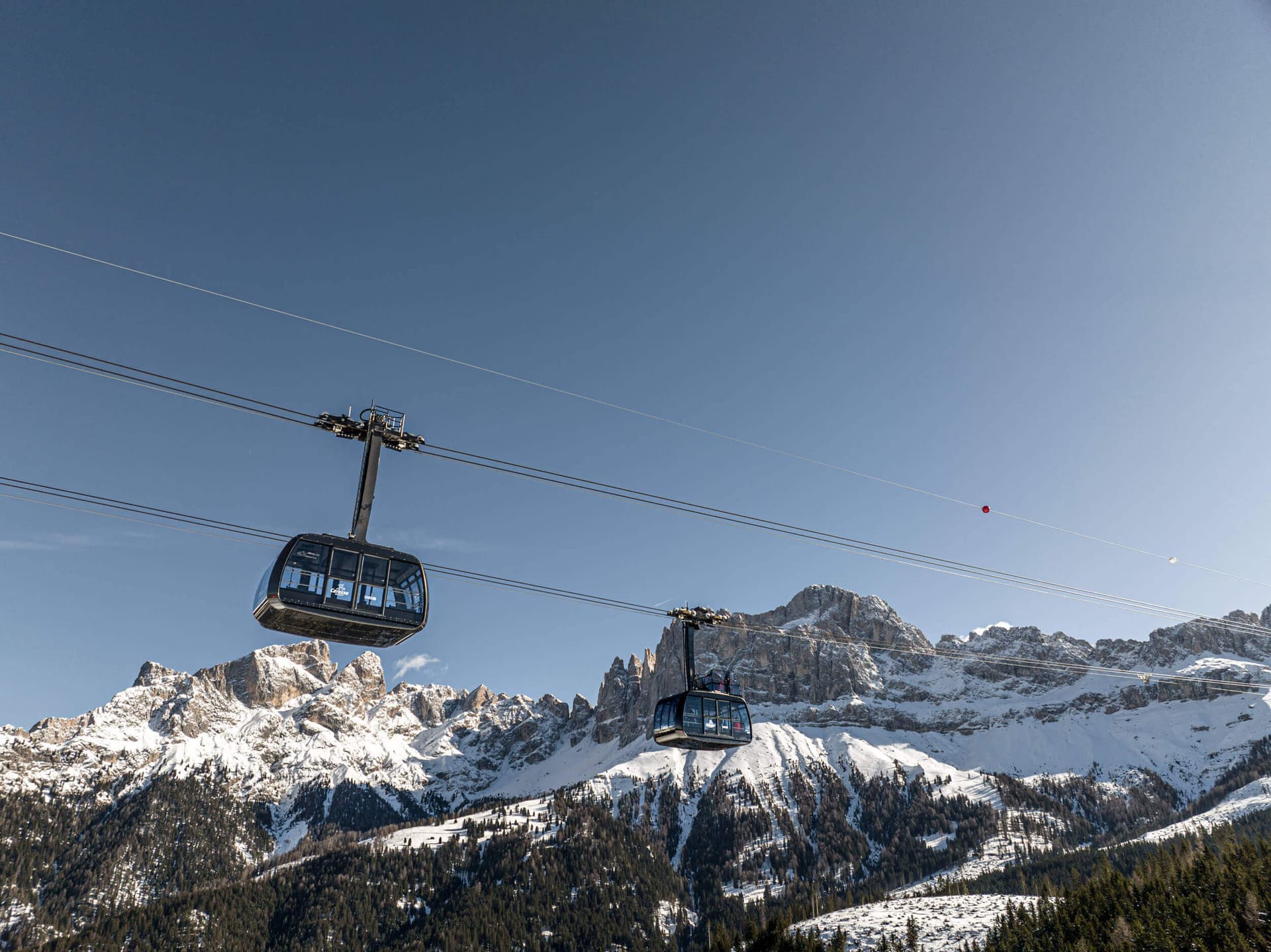 A soli 500 m dall'hotel si trova la nuova cabinovia di San Cipriano. Collega direttamente Tires con l'area escursionistica e sciistica di Carezza sul Catinaccio – senza bisogno dell'auto. D'estate si raggiungono così senza fatica sentieri in quota, malghe e percorsi panoramici. D'inverno la funivia vi porta nel cuore del comprensorio sciistico più soleggiato dell'Alto Adige – con oltre 40 chilometri di piste. Comodo, ecologico e direttamente dall'hotel.